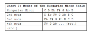 Today’s enterprising musician may likewise construct “modes” based on some exotic (non-diatonic) scale, yielding still more inflections or tonal dialects, still more musical variety. For instance, the modes based on the Hungarian Minor scale would begin like this:
