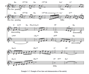 En P y P2 continúa el mismo proceso, aunque en tonalidades diferentes, y en P1 y P3 está un poco acostumbrado. Los restos de la melodía principal también se encuentran en la subsección S(P). Al igual que en Soledad, hay una gran cantidad de progresiones de acordes II-V-I ‘jazzy’ en modo menor; Las quintas y novenas alteradas se utilizan con frecuencia. A excepción de T y 2T, la línea de bajo está pendiente, moviéndose en quintas o moviéndose en movimiento descendente. En la siguiente ilustración, observe cómo el uso de la reinterpretación del acorde en el compás cuatro (C#7b9/B a E13b9no1/B) permite una transferencia inmediata a Am.