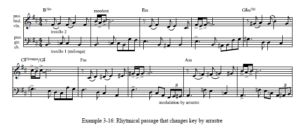 Los cambios de áreas clave entre subsecciones entran sin quintos movimientos en la línea de bajo. En cambio, los cambios se caracterizan por un movimiento cromático ascendente. O es sólo la melodía la que se mueve, o es a la vez la melodía y la línea de bajo. El gesto de la línea de bajo probablemente se deriva del gesto de arrastre y por eso defino este tipo de cambio de tono como “cambio de área de tono por arrastre”.