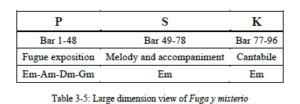 Al igual que en Fugata, prefiero analizar Fuga y misterio en tres apartados: exposición de la fuga; sección media con melodía y acompañamiento; y una coda-sección de cierre, que difiere de las dos primeras secciones.