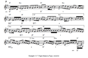 La exposición de la fuga es bastante similar a la de Fugata, especialmente en lo que respecta al tratamiento de los gestos, el contrapunto y el cambio de áreas clave; Es bastante claro ver las influencias de Piazzolla de las invenciones de Bach. Observe también cómo el uso del rubato instrumental implica automáticamente que los ritmos del tresillo están acentuados.