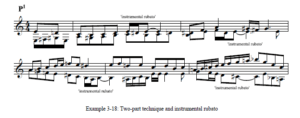 El segundo, que describe la relación entre la voz superior y la línea de bajo, he optado por definirlo como “ambitus uniforme”. Parece que cuando la línea de bajo está pendiente, la voz superior tiene un papel más activo; se mueve en arpegios y presenta repetidamente una progresión de acordes inmanente. En consecuencia, cuando la línea de bajo es más activa, el ambitus de la melodía disminuye.