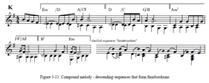 La melodía suele tener un movimiento escalonado o un movimiento en forma de saltos, que alcanza las notas de los acordes.