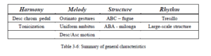 Este capítulo enfatizará técnicas y eventos musicales que son, en una perspectiva general, comunes a las composiciones que han sido analizadas. Como sugirió LaRue, he optado por categorizar las características de la música de Piazzolla que he encontrado en cuatro categorías: armonía; melodía; ritmo; y estructura (prefiero usar estructura como categoría en lugar de crecimiento). Los bocetos y las tablas no son reglas exactas de cómo funciona la música de Piazzolla; más bien deben considerarse como sugerencias sobre cómo relacionarse con su estilo de composición.