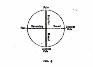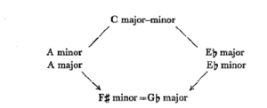 Consequently the balance is saved, and the function is invariably that of the tonic. The counterpole is born. Similarly the distance between the tonic C and F# is bisected by Eb ( =D#) in the one and by A in the other direction; so lying in tensionless, neutral section points, they also have to be interpreted as tonics,. No more than four tonic poles can be surmised, since the intervals C-Eb, Eb-F#, F#-A, A-C provide no further points of bisection.