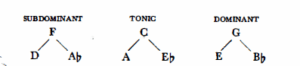 Every tonal system presupposes a centre as well as subordinate relations dependent on the centre. Taking again C as the tonic centre, the three functions are represented most potently by those degrees dividing the circle of fifths into three equal parts, i.e. in the augmented triad C-E-Ab. Properties inherent in classical harmony are responsible for the E assuming a dominant function and Ab, a subdominant function in relation to the tonic C.