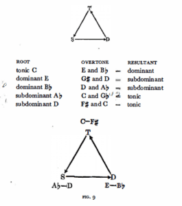 (e) Starting from the tonic centre C we reach the dominant in one direction and the subdominant in the other, in identical latitudes. At a distance of i fifth we find the dominant G upwards and the subdominant F downwards. Regarding overtone relations we also get the dominant G, E, Bb, in the upper and the subdominant F, Ab, D the lower directions.