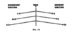 (f) Thus, observing the logic of functional interconnection of the three axes, another interesting point arises. The subdominant and dominant are represented most effectively not by the degrees IV and V but, in the case of C tonality, the subdominant by Ab, (and its counterpole), the dominant by E (and its counterpole).